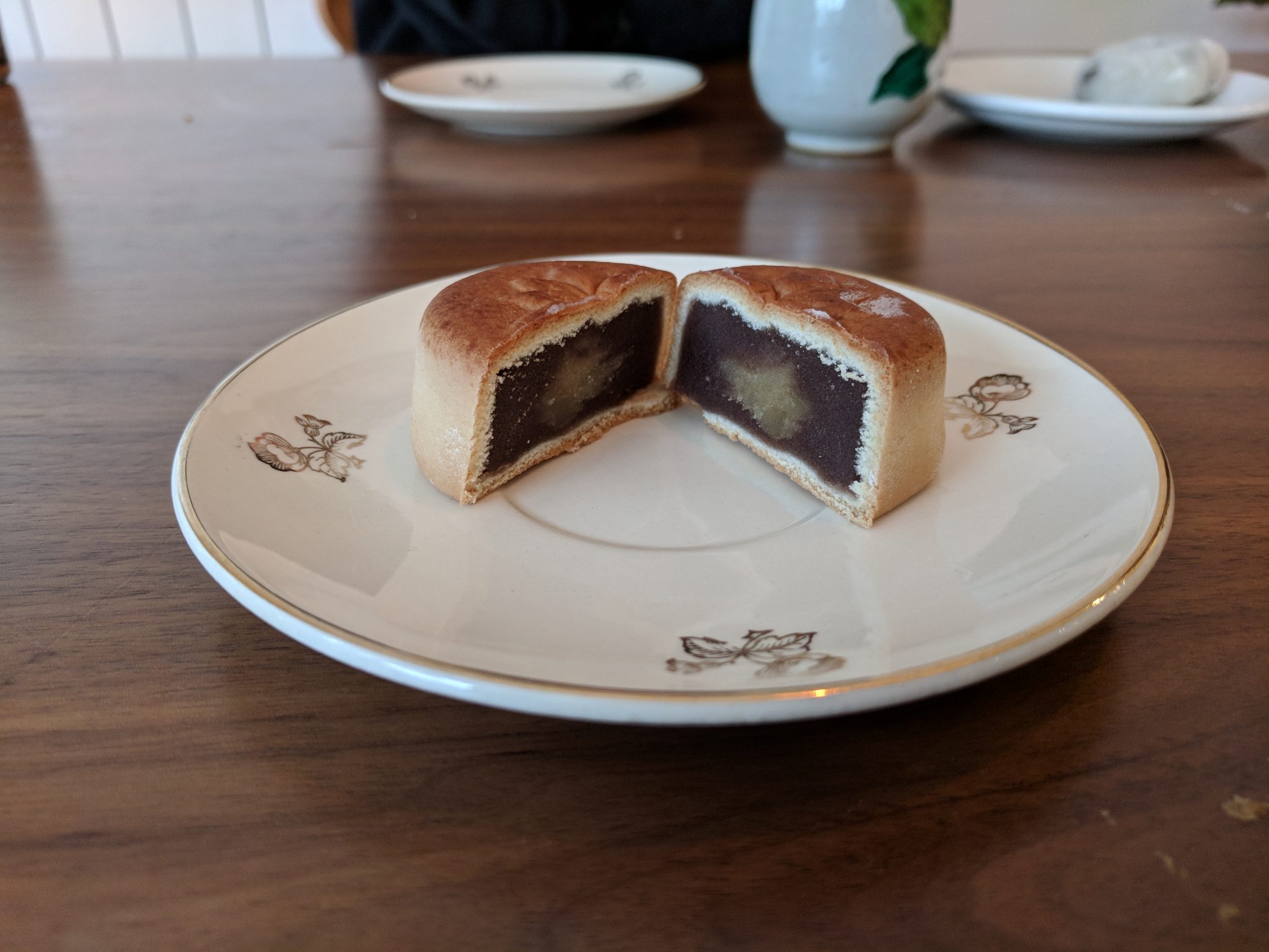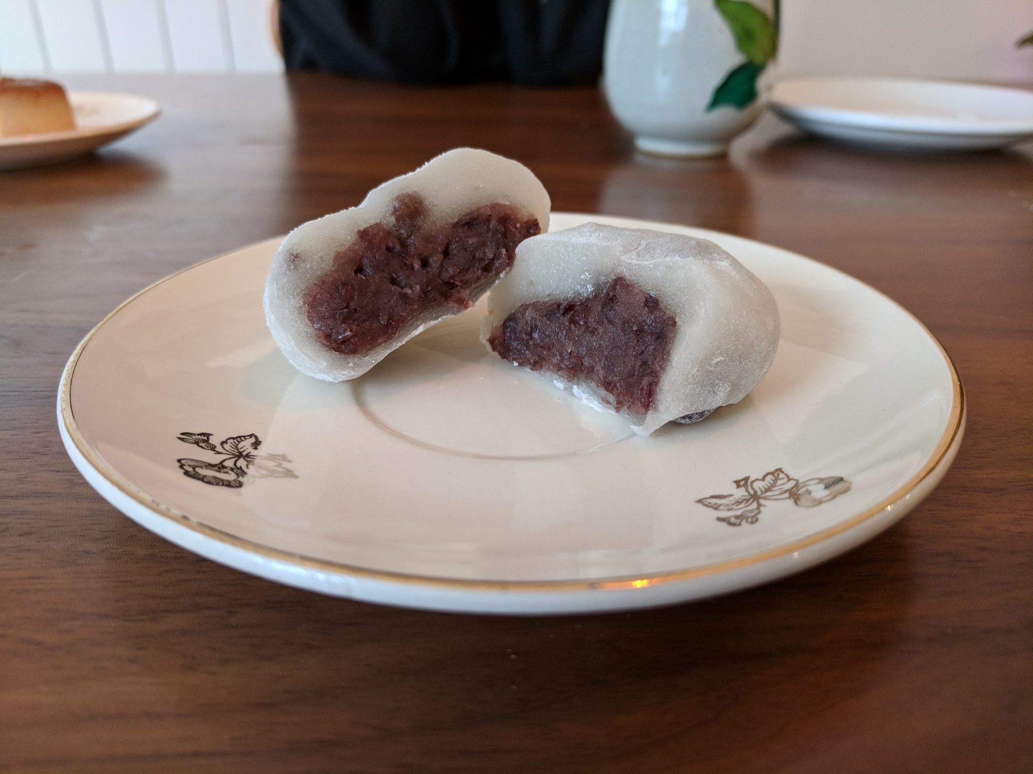 Unfortunately, an accident happened. I was reaching for something on the upper shelf and dropped a pack of tea on the kitchen counter exactly where the hohin teapot was sitting, knocking it down to the floor causing complete breakage of the gentle ceramic. For the first few minutes I was really upset. I bought the teapot not too long ago and only used it a few times. It was not the cheapest of things and it took a few weeks to arrive from Japan. Then I thought of the ubiquitous Japanese phrase, shōganai (しょうがない), it can’t be helped. I can always order a new teapot, which will be even better. With that in mind I made Sencha tea instead and enjoyed the Japanese cakes with my daughter.